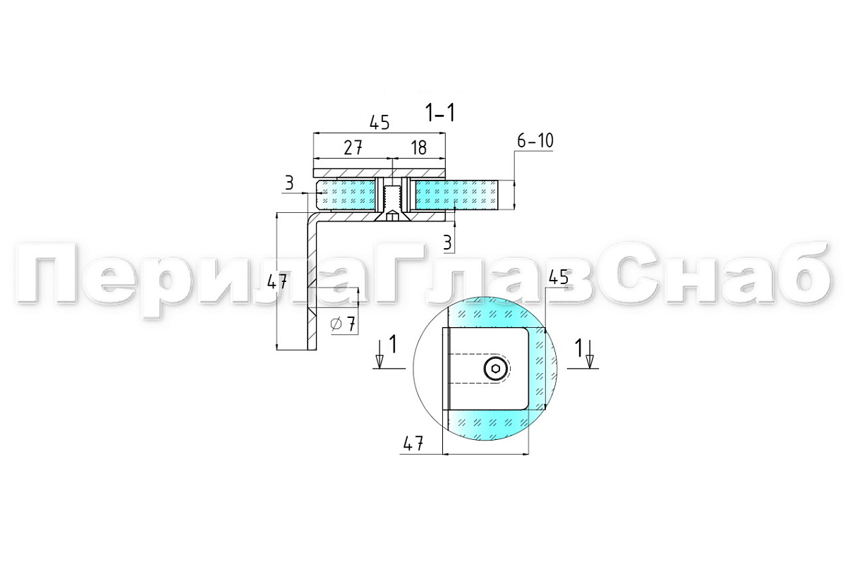 Коннектор для душевой кабины стена-стекло 90°, 45х45, полированный. Марка стали - AISI 304