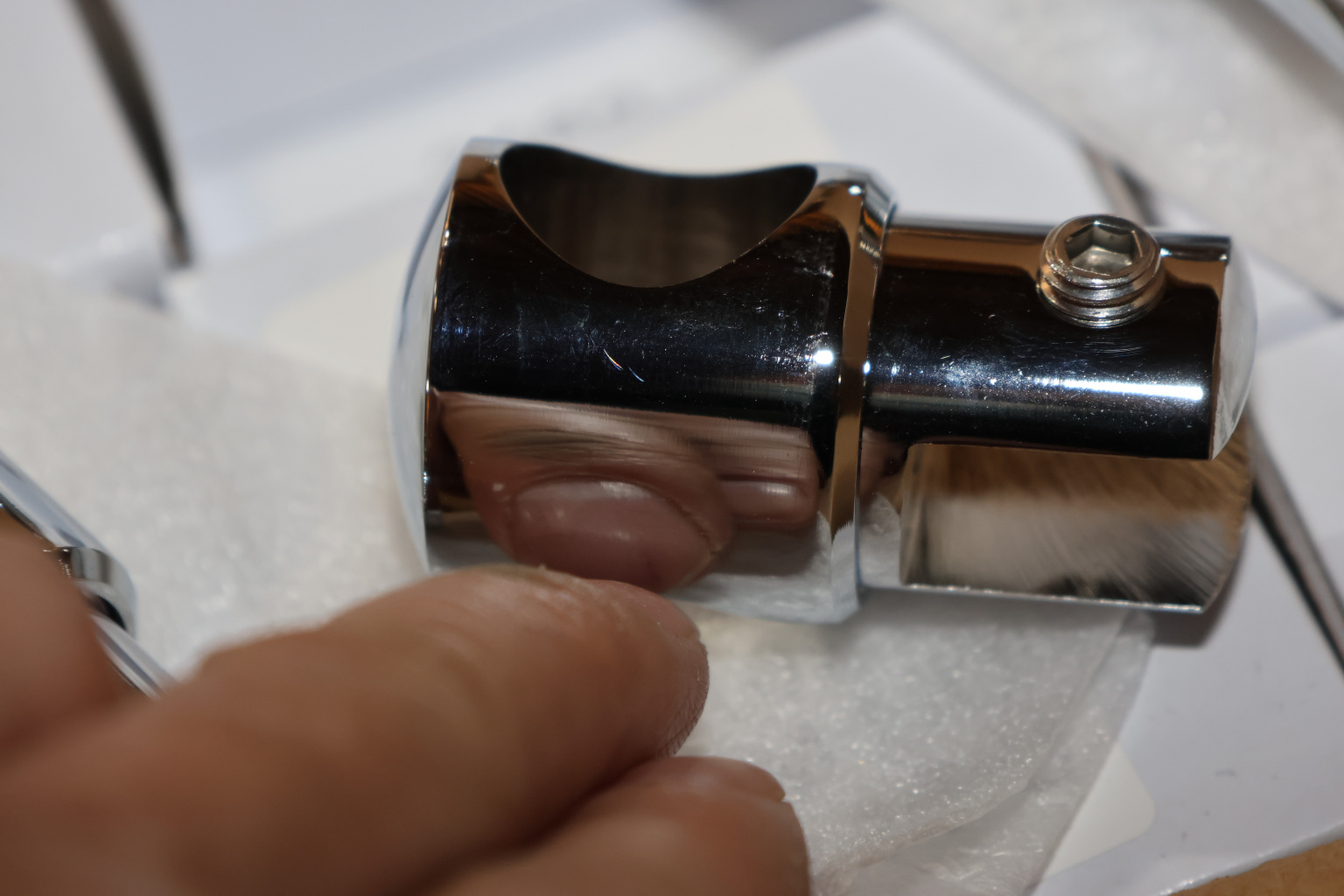 Крепежный элемент труба-стекло. Предназначен для соединения штанги в душевых кабинах со стеклом на любом участке штанги. Материал - латунь-хром, поверхность - полированная