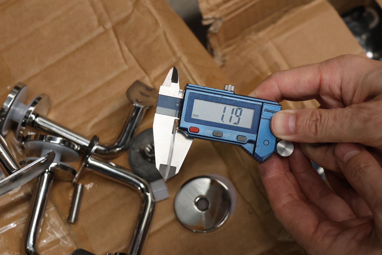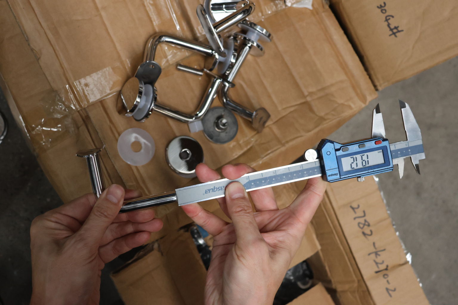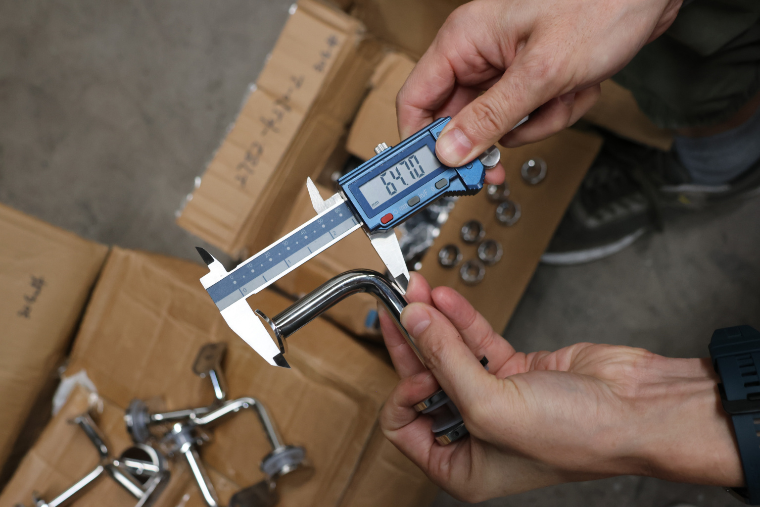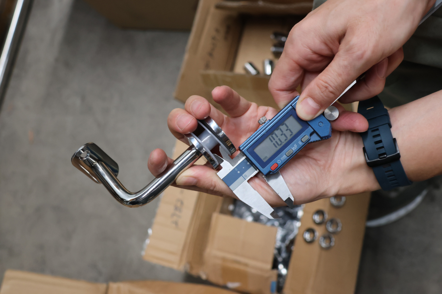Для установки бокового держателя в стекле сверлится отверстие диаметром 17 мм, затем пристенок фиксируется затяжной гайкой в торце фланца. А сам поручень приваривается к загнутому наконечнику фитинга.