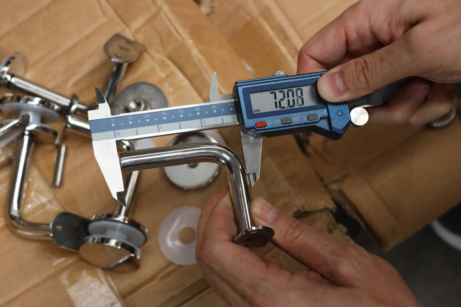 Для установки бокового держателя в стекле сверлится отверстие Ø17 мм, затем пристенок фиксируется затяжной гайкой в торце фланца. А сам поручень приваривается к загнутому наконечнику фитинга.