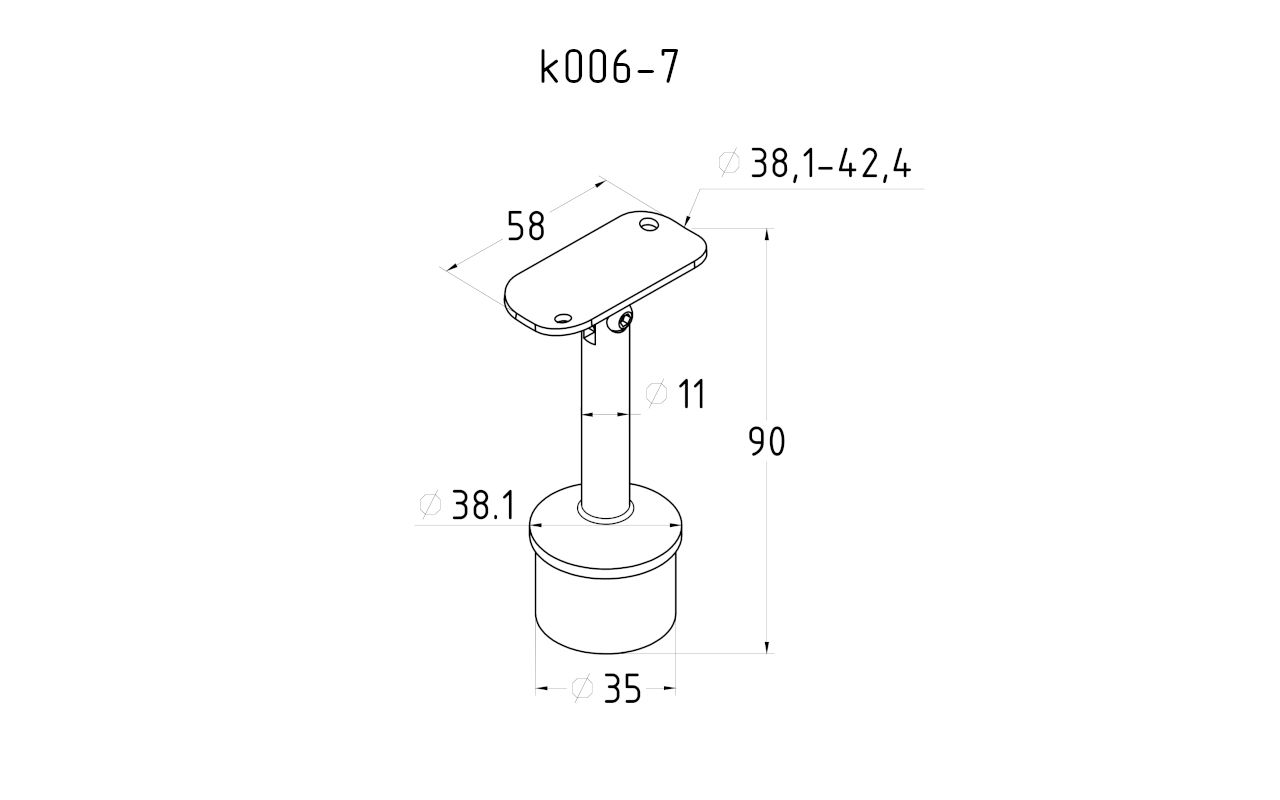 Предназначен для стойки Ø38.1 мм (k819, k849) под поручень Ø38,1-42,4 мм. Деталь с регулируемым ложементом и отверстиями под саморезы. Можно крепить как на сварку, так и на специальный клей ( , ). На сегодняшний день это наиболее распространенный тип наконечников стоек, повсеместно используемый в монтаже ограждений.