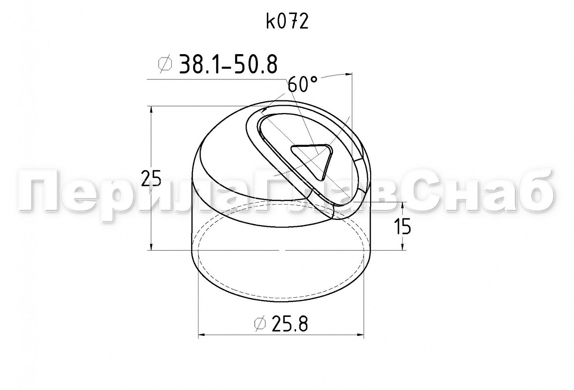 Наконечник штампованный (СПС) косой 30° на трубу Ø25 мм, для поручня Ø38.1 мм, полированный, нержавеющий, AISI 304, k072
