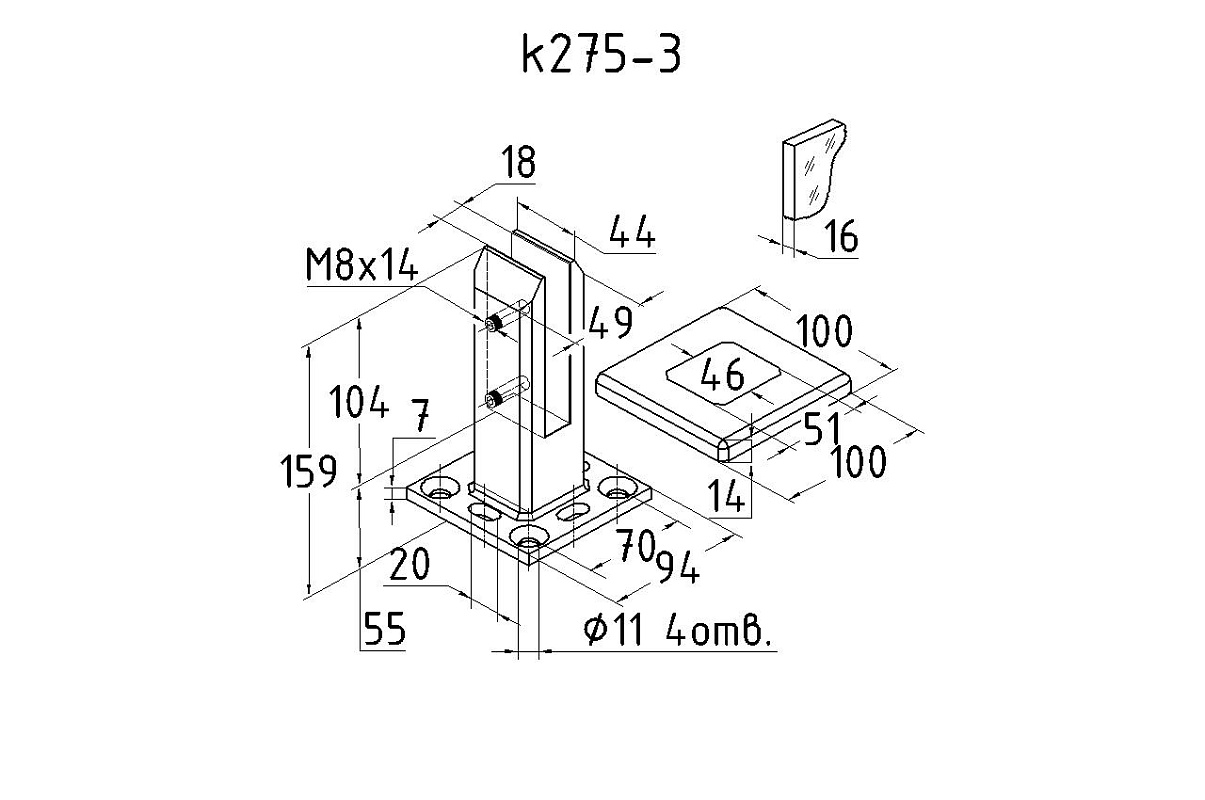 Стеклодержатель литой напольный, 50х50х160 мм, для стекла 16 мм, полированный, 600 Grit, без сверления. Марка стали - AISI 304. Так же вам понадобиться для крепежа потайной винт под шестигранник k601-19-120