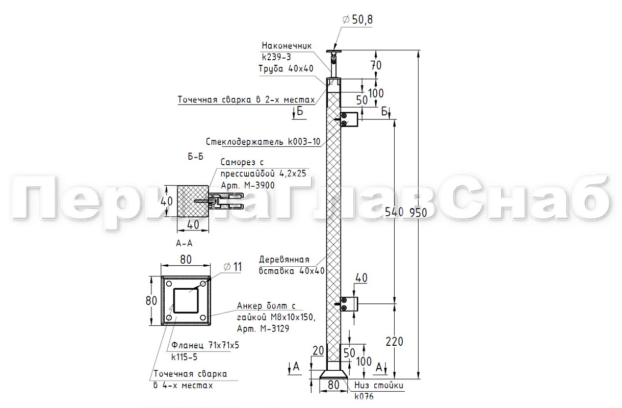Готовая стойка 40х40х950 мм, деревянная, со вставками из нержавеющей стали 2х100 мм с 3 ригеледержателями k740-1-G купить в Симферополе