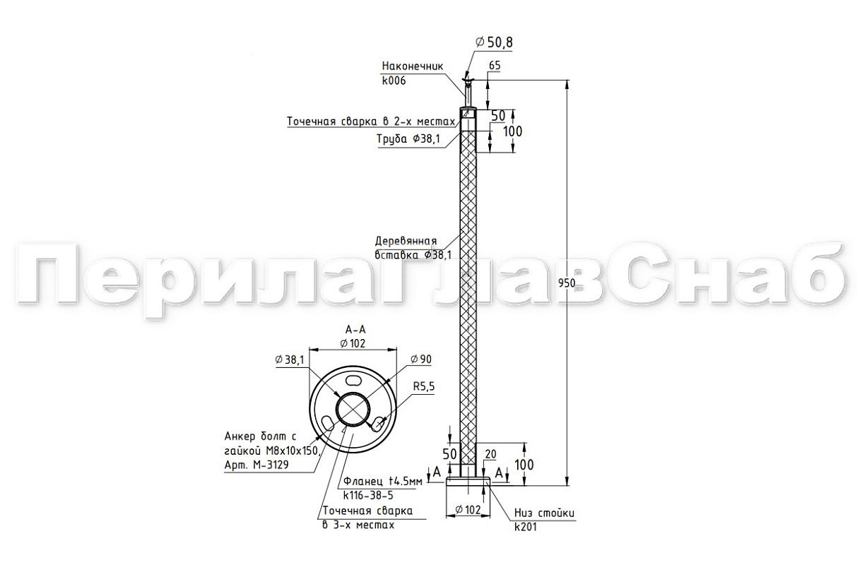 Готовая стойка Ø38,1х950мм деревянная, со вставками из нержавеющей стали 2х100мм под золото, базовая