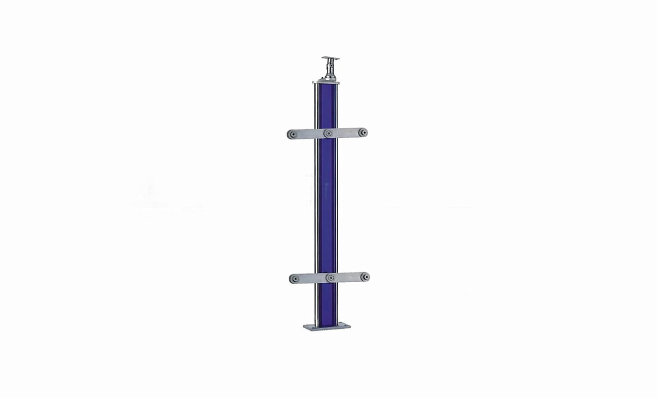 Стойка эксклюзивная с акриловой вставкой и двумя пластинчатыми стеклодержателями, крепление в пол, регулируемый ложемент (AISI 304) k781