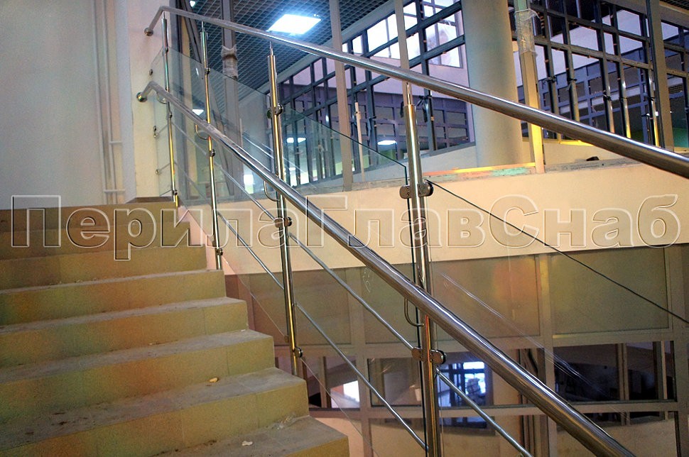 Ограждение со стеклом в детском садике города Железнодорожный отличается от типовой конструкции подобного рода наличием вспомогательного так называемого «детского» поручня.