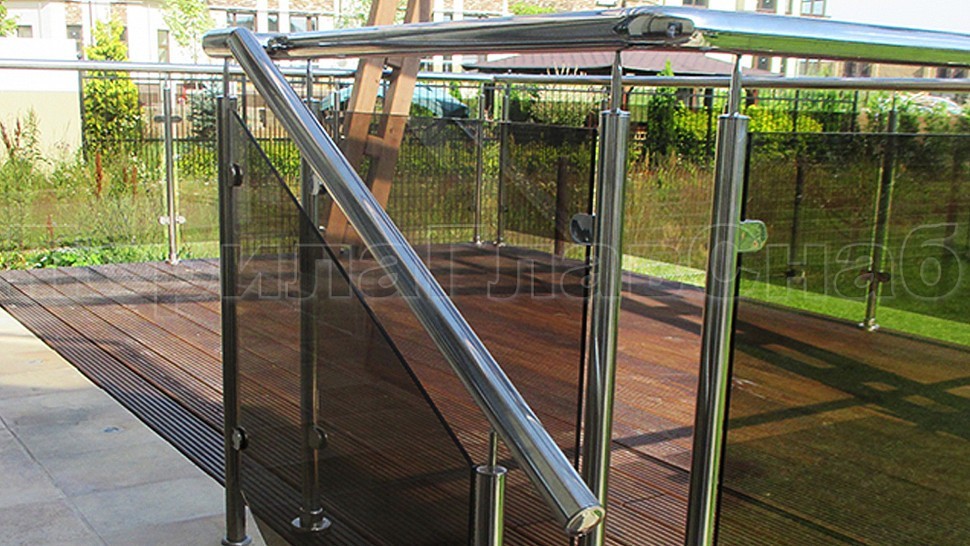 Такой заказ был принят и одобрен на монтаж ограждения террасы из полированной нержавеющей стали со стеклом, высотой 950 мм. Стойка труба диаметром 38 мм, низ стойки цанга, верх стойки штырь, с закаленным стеклом цвет "бронза" 8 мм и с полировкой кромок по периметру, с литыми стеклодержателями и порученем из полированной нержавеющей стали диаметром 50 мм. Стойки устнавливаются в горизонте с шагом кратно 900-1200 мм на фланце в деревянный настил на саморезах. Поручень завязан отводами диаметром 50 мм. Крепление нержавеющих элементов ограждения между собой точечная аргонно-дуговая сварка, длина швов 2 мм, с последующей зачисткой и полировкой.
