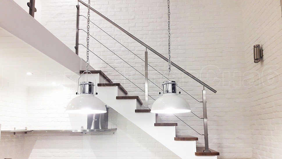 Ограждение лестницы по маршу выполнена из полированной нержавеющей стали марки Aisi 201. Высота поручня 950 мм, стойки 40х40 мм крепление сверху методом алмазного бурения устанавливаются на прямых участках 1000-1200 мм друг от друга, трос проходит сквозь стойку крепится к стойке через специальные талрепы находящиеся на крайних стойках, устанавливается равномерно по высоте стойки; поручень крепится к стоике через наконечник штырь, в начале и конце поручня заглушка.