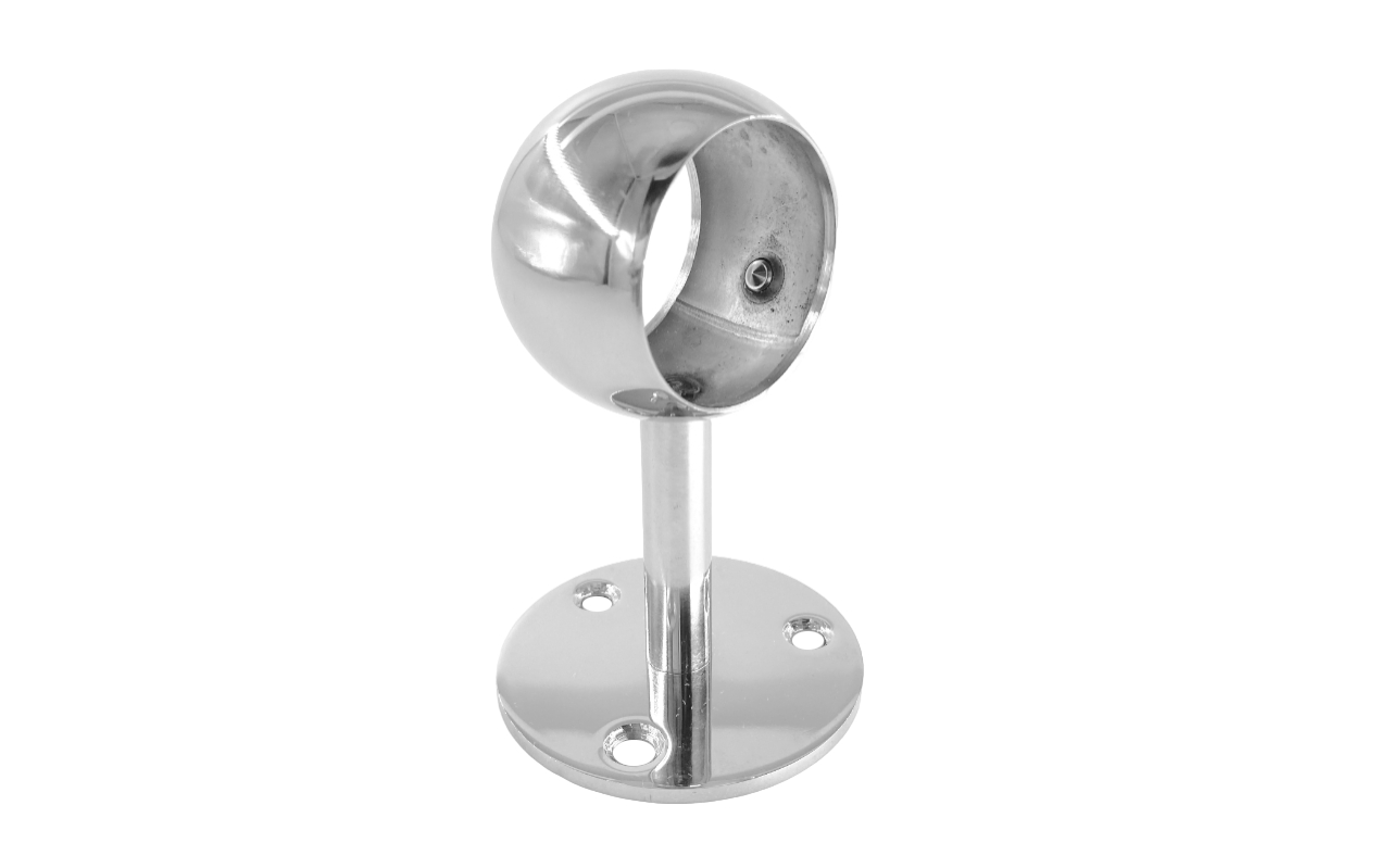 Крепление шаровидное сквозное обладает серьезным запасом прочности, благодаря толщине металла и литьевой технологии, по которой данный пристенок изготовлен. Для надежной фиксации поручня применяется обхват внутрь которого заправляется труба нержавеющих перил пристенного поручня.