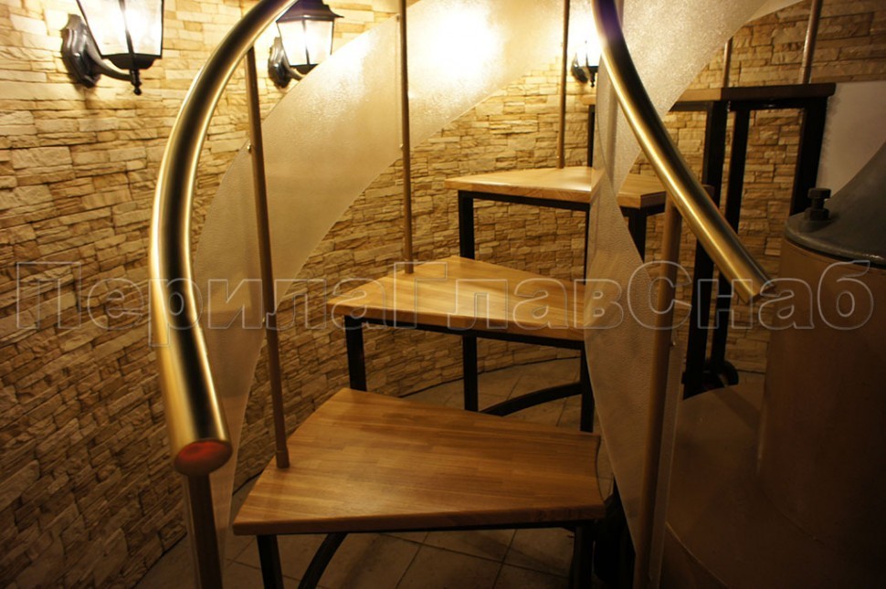 - Ограждение лестницы со стеклом, тонированным в массе, стойки и завязки поручня из латуни