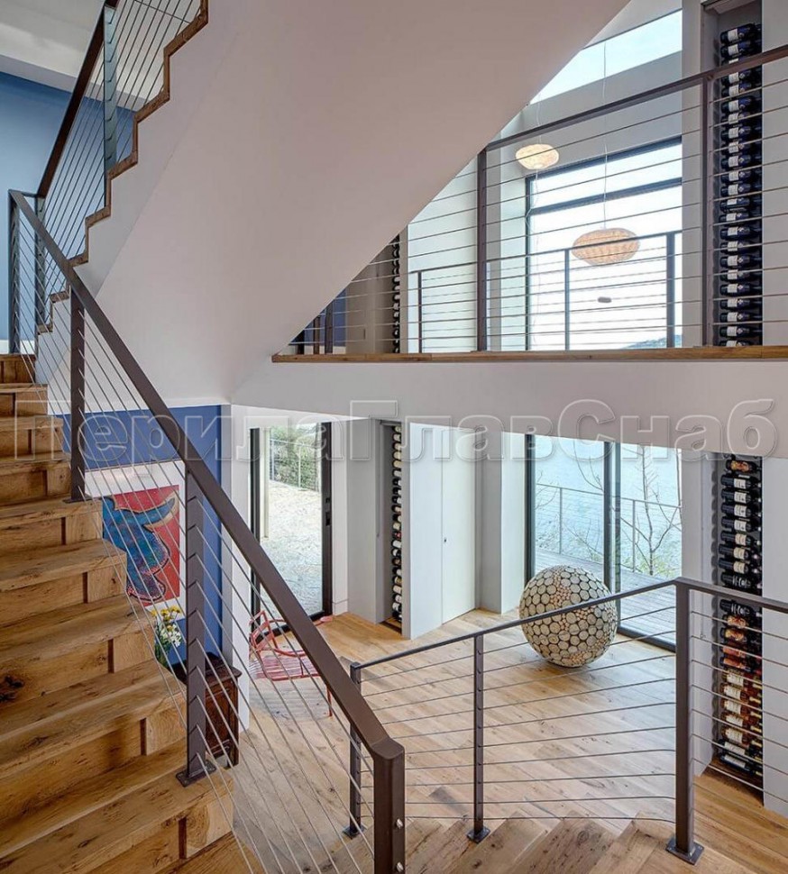 Лестничное ограждение с тремя ригелями и поручнем из латуни