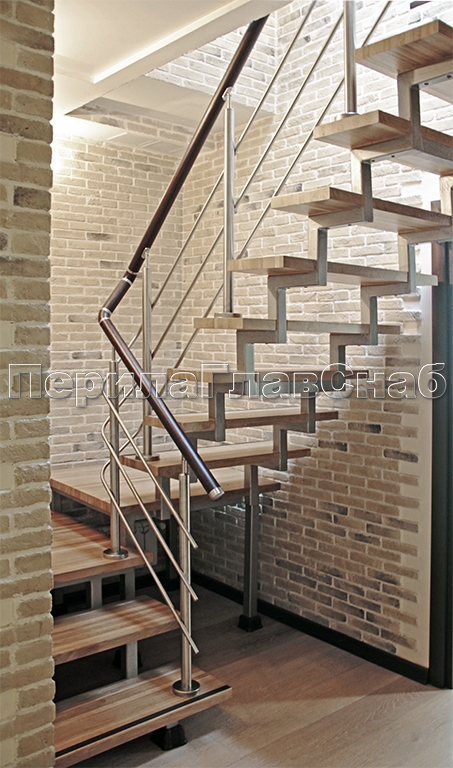 Ограждение лестницы на квадратных стойках с латунным поручнем