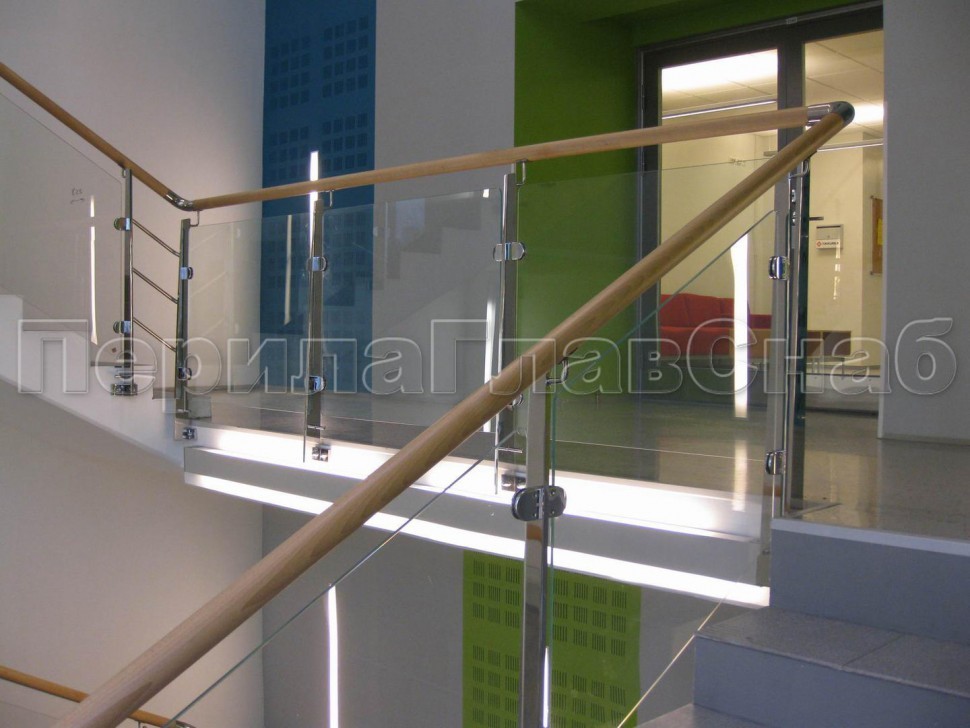 Ограждение с деревянным поручнем с зажимными стеклодержателями и стойками